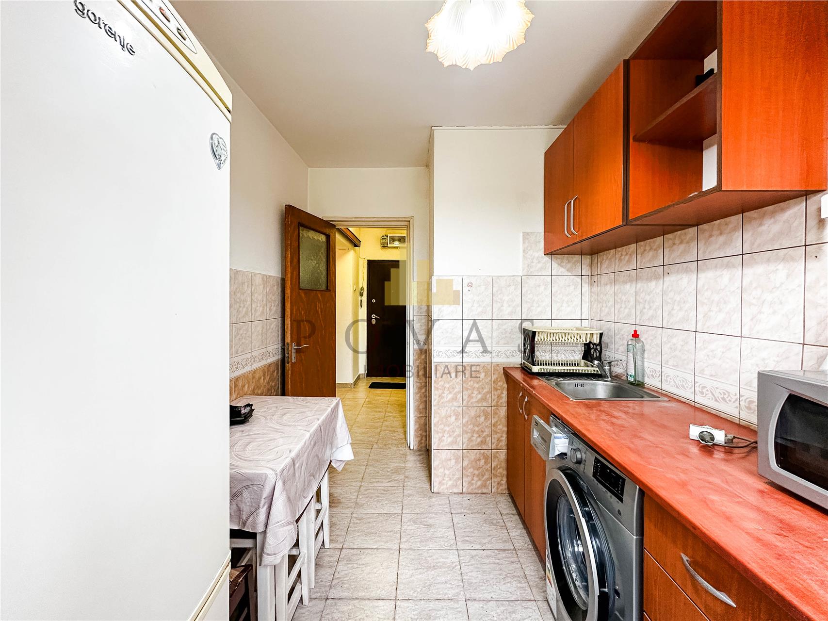 Mobilat si Utilat: Bucatarie inchisa, complet echipata (aragaz, frigider, masina de spalat rufe, hota, cuptor cu microunde).
