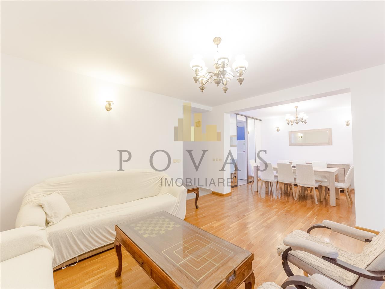 ? 120 mp utili, 3 camere (2 dormitoare + living), 2 băi și o bucătărie inchisa, mobilată și utilată.